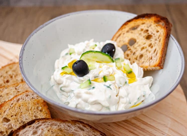 - Finally top your vegan tzatziki off with some olives, some chopped up cucumber and a drizzle of olive oil.