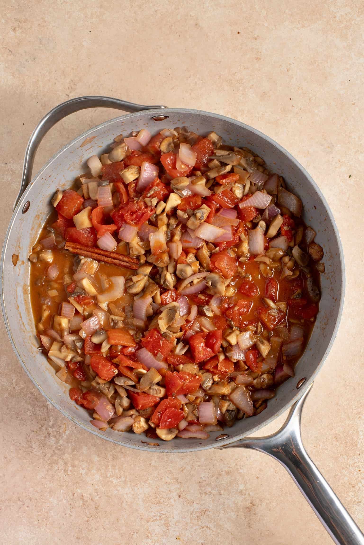 3. Now it’s time to prepare a delicious mushroom based sauce for your vegetarian moussaka. Heat a pan to medium-high heat and add the olive oil. Stir in the chopped mushrooms and sauté, until most of the juices have evaporated. Add the chopped onions and garlic and sauté. Pour in the wine and wait to evaporate. Add the tinned tomatoes, mushing them with a wooden spoon, the sugar, cinnamon and a good pinch of salt and pepper. Bring to the boil, turn the heat down and simmer for about 15 minutes until most of the juices have evaporated and the sauce thickens.